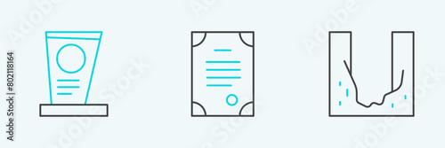 Set line Cemetery digged grave hole, Grave with tombstone and Death certificate icon. Vector