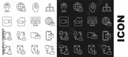 Set line Cloud storage document folder, Freelancer, Online working, Video camera Off home, Camera, and chat conference icon. Vector