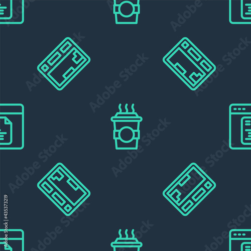 Set line Coffee cup to go, Keyboard and Software on seamless pattern. Vector