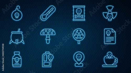 Set line Coffee cup with skull, Radiation warning document, Radioactive waste barrel, Fly agaric mushroom, Witch cauldron, Nuclear bomb, Biohazard symbol and Thermometer icon. Vector