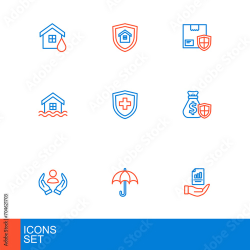 Set line Contract in hand, Umbrella, Life insurance, Money bag with shield, House flood, Delivery security and icon. Vector