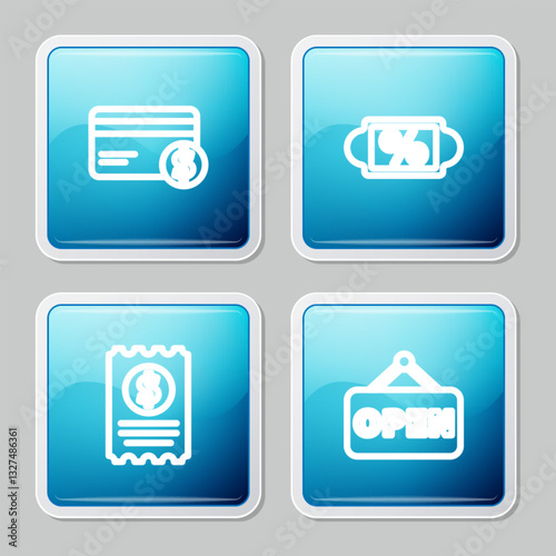 Set line Credit card and dollar, Discount percent tag, Paper check financial check and Hanging sign with Open icon. Vector