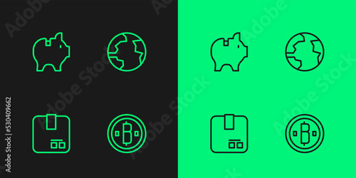 Set line Cryptocurrency coin Bitcoin, Carton cardboard box, Piggy bank and Worldwide icon. Vector