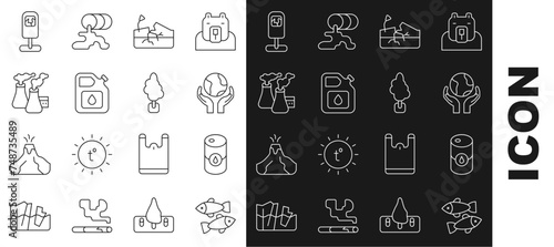 Set line Dead fish, Barrel oil, Hands holding Earth globe, Earthquake, Canister for gasoline, Smoke from factory, Trash can and Tree icon. Vector