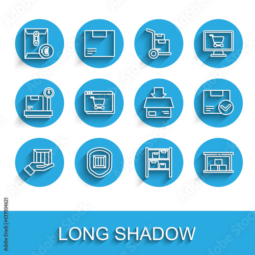 Set line Delivery hand with boxes, security shield, Envelope euro symbol, Warehouse, Online shopping on screen, Package check mark and Carton cardboard icon. Vector
