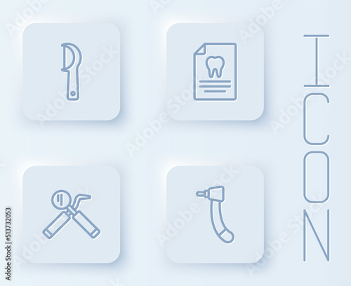 Set line Dental floss, Clipboard with dental card, mirror and probe and Tooth drill. White square button. Vector