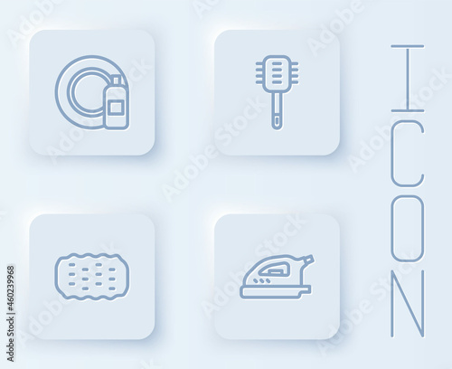 Set line Dishwashing bottle and plate, Toilet brush, Sponge and Electric iron. White square button. Vector