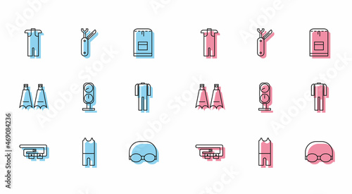 Set line Diving belt, Wetsuit for scuba diving, Glasses and cap swimming, Gauge scale, Rubber flippers and Swiss army knife icon. Vector