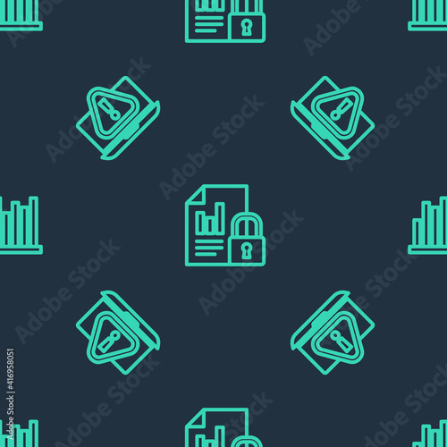 Set line Document and lock, Laptop with exclamation mark and Pie chart infographic on seamless pattern. Vector.