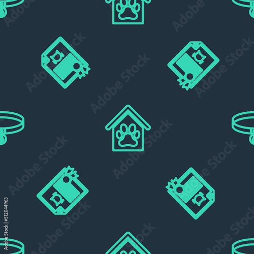 Set line Dog house and paw print pet, Certificate for dog or cat and Collar with name tag on seamless pattern. Vector