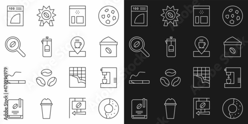 Set line Donut with sweet glaze, Coffee machine, Bag coffee beans, French press, Selection, paper filter and Location cup icon. Vector