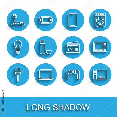Set line Electric plug, Laptop, Router and wi-fi signal, Air headphones, Graphic tablet, USB flash drive, Microwave oven and Radio with antenna icon. Vector