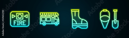 Set line Fire alarm system, truck, boots and shovel and bucket. Glowing neon icon. Vector