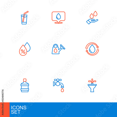 Set line Fountain, Water tap, Big bottle with clean water, Recycle aqua, drop percentage, Watering can, Washing hands soap and location icon. Vector