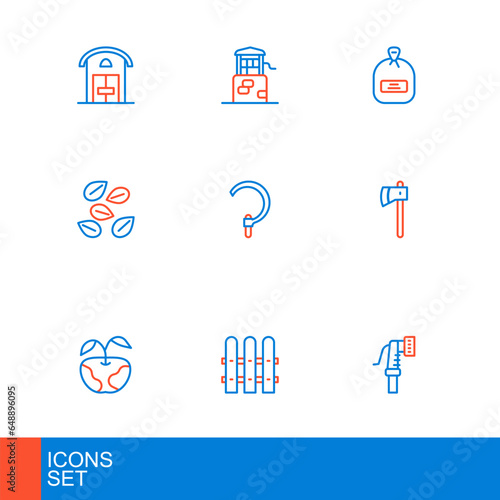Set line Garden hose, fence wooden, Apple, Wooden axe, Seeds of specific plant, Sickle, Pack full seeds and Well icon. Vector