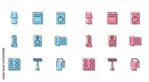 Set line Gas stove, Electric heater, Table lamp, Power bank with different charge cable, Stereo speaker, Telephone, Blender and Oven icon. Vector