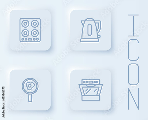 Set line Gas stove, Electric kettle, Fried eggs on frying pan and Oven. White square button. Vector