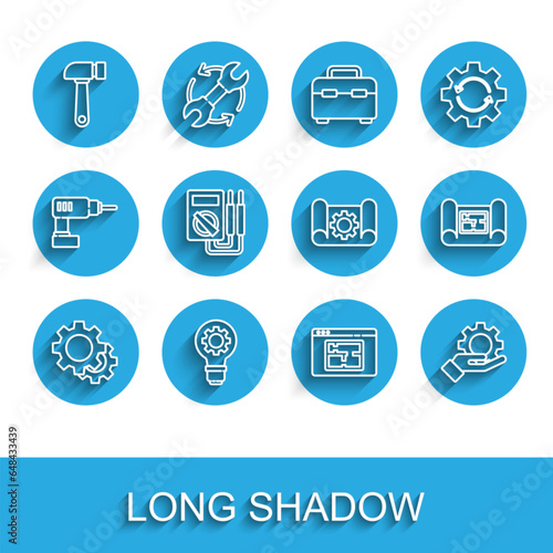 Set line Gear, Light bulb and gear, Hammer, House plan, Settings in the hand, Multimeter, and Graphing paper icon. Vector