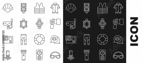 Set line Glasses and cap, Scallop sea shell, Flashlight, Life jacket, Turtle, Diving mask snorkel, and watch icon. Vector