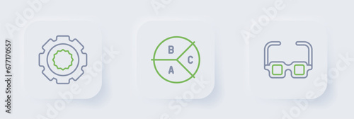 Set line Glasses, Pie chart infographic and Gear icon. Vector