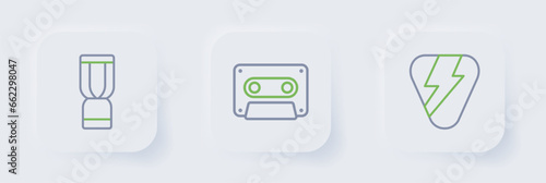 Set line Guitar pick, Retro audio cassette tape and African djembe drum icon. Vector