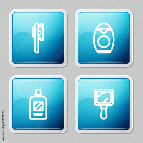 Set line Hairbrush, Bottle of shampoo, and Hand mirror icon. Vector