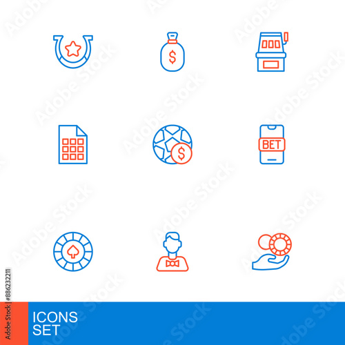 Set line Hand holding casino chips, Casino dealer, Online sports betting, Lottery ticket, Football money, Slot machine and Money bag icon. Vector