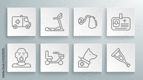 Set line Head of deaf and dumb, Treadmill machine, Electric wheelchair, Guide dog, Crutch or crutches, Hearing aid, Identification badge and Emergency car icon. Vector