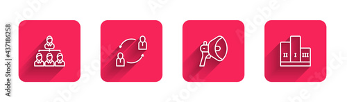 Set line Hierarchy organogram chart, Human resources, Megaphone and Award over winner podium with long shadow. Red square button. Vector