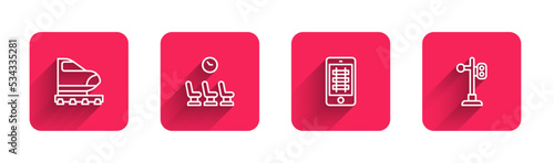 Set line High-speed train, Waiting room, Buy ticket online and Train traffic light with long shadow. Red square button. Vector