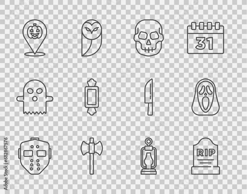 Set line Hockey mask, Tombstone with RIP written, Skull, Wooden axe, Pumpkin, Candy, Camping lantern and Funny scary ghost icon. Vector