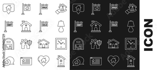 Set line Home symbol, Clock, Table lamp, Hanging sign with text Sold, House, Rent, Map pointer house and Sale icon. Vector
