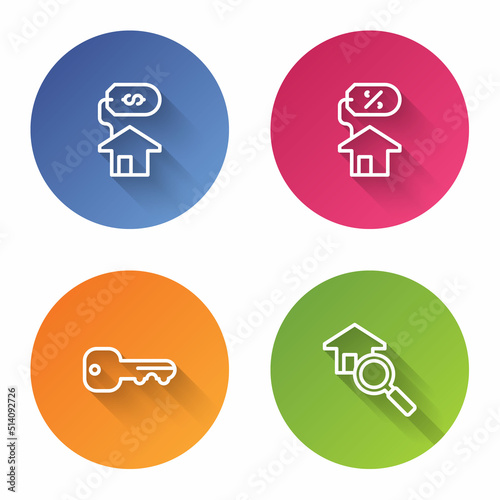 Set line House with dollar, percant, key and Search house. Color circle button. Vector