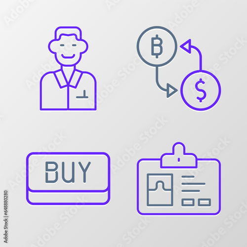 Set line Identification badge, Buy button, Cryptocurrency exchange and Trader icon. Vector