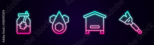 Set line Jar of honey and dipper stick, Honeycomb, Hive for bees and Beekeeping brush. Glowing neon icon. Vector