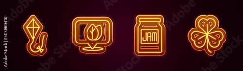 Set line Kite, Location with leaf, Jam jar and Clover. Glowing neon icon. Vector