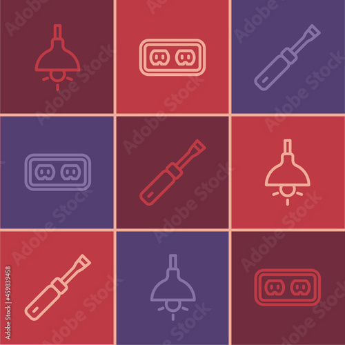Set line Lamp hanging, Screwdriver and Electrical outlet icon. Vector