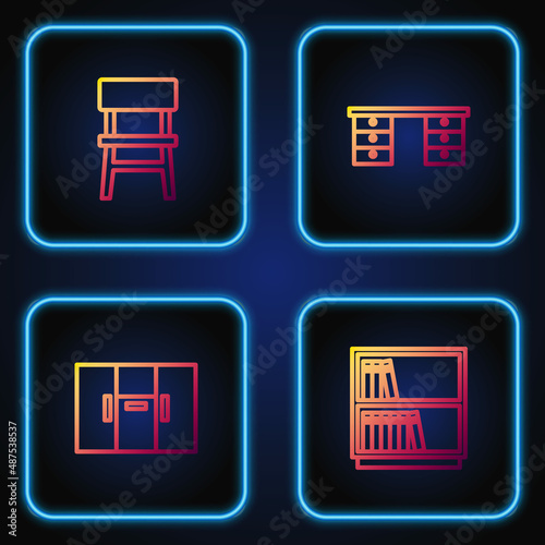 Set line Library bookshelf, Wardrobe, Chair and Office desk. Gradient color icons. Vector
