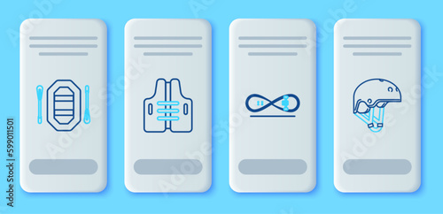 Set line Life jacket, Skateboard trick, Rafting boat and Helmet icon. Vector
