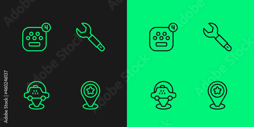 Set line Location with star, taxi car, Taxi mobile app and Wrench spanner icon. Vector