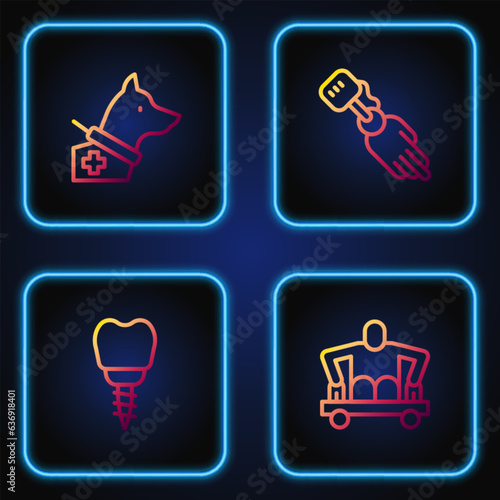 Set line Man without legs sitting wheelchair, Dental implant, Guide dog and Prosthesis hand. Gradient color icons. Vector