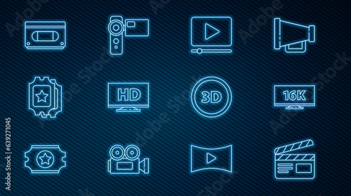 Set line Movie clapper, Screen tv with 16k, Online play video, Smart display HD, Cinema ticket, VHS cassette tape, 3D word and camera icon. Vector