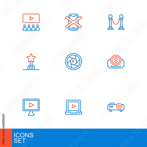 Set line Movie, film, media projector, Online play video, Cinema ticket, trophy, Camera shutter, Rope barrier and No cell phone icon. Vector
