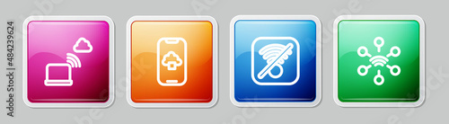 Set line Network cloud connection, Cloud technology data, No Wi-Fi wireless internet and . Colorful square button. Vector