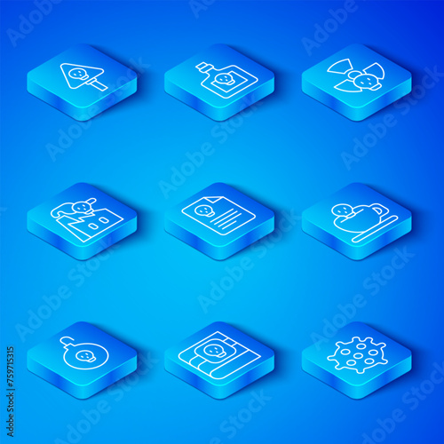 Set line Nuclear bomb, Radiation warning document, Book about poisons, Coffee cup with skull, Radioactive, Smoke from factory, Bones and and Bacteria icon. Vector