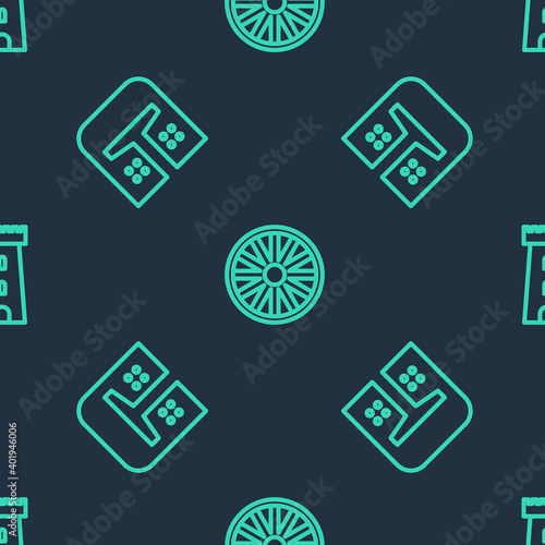 Set line Old wooden wheel, Medieval iron helmet and Castle tower on seamless pattern. Vector.