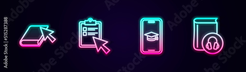 Set line Online book, quiz, test, survey, Graduation cap on mobile and Audio. Glowing neon icon. Vector