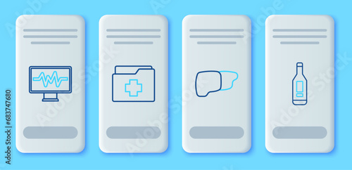 Set line Patient record, Human organ liver, Monitor with cardiogram and Digital thermometer icon. Vector