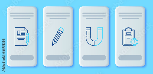 Set line Pencil with eraser, Magnet, Exam sheet and pencil and clock icon. Vector