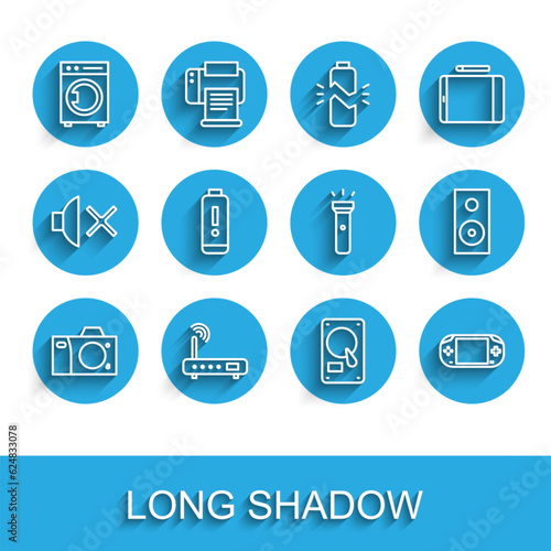 Set line Photo camera, Router and wi-fi signal, Washer, Hard disk drive HDD, Portable video game console, Battery charge level indicator, Stereo speaker and Flashlight icon. Vector